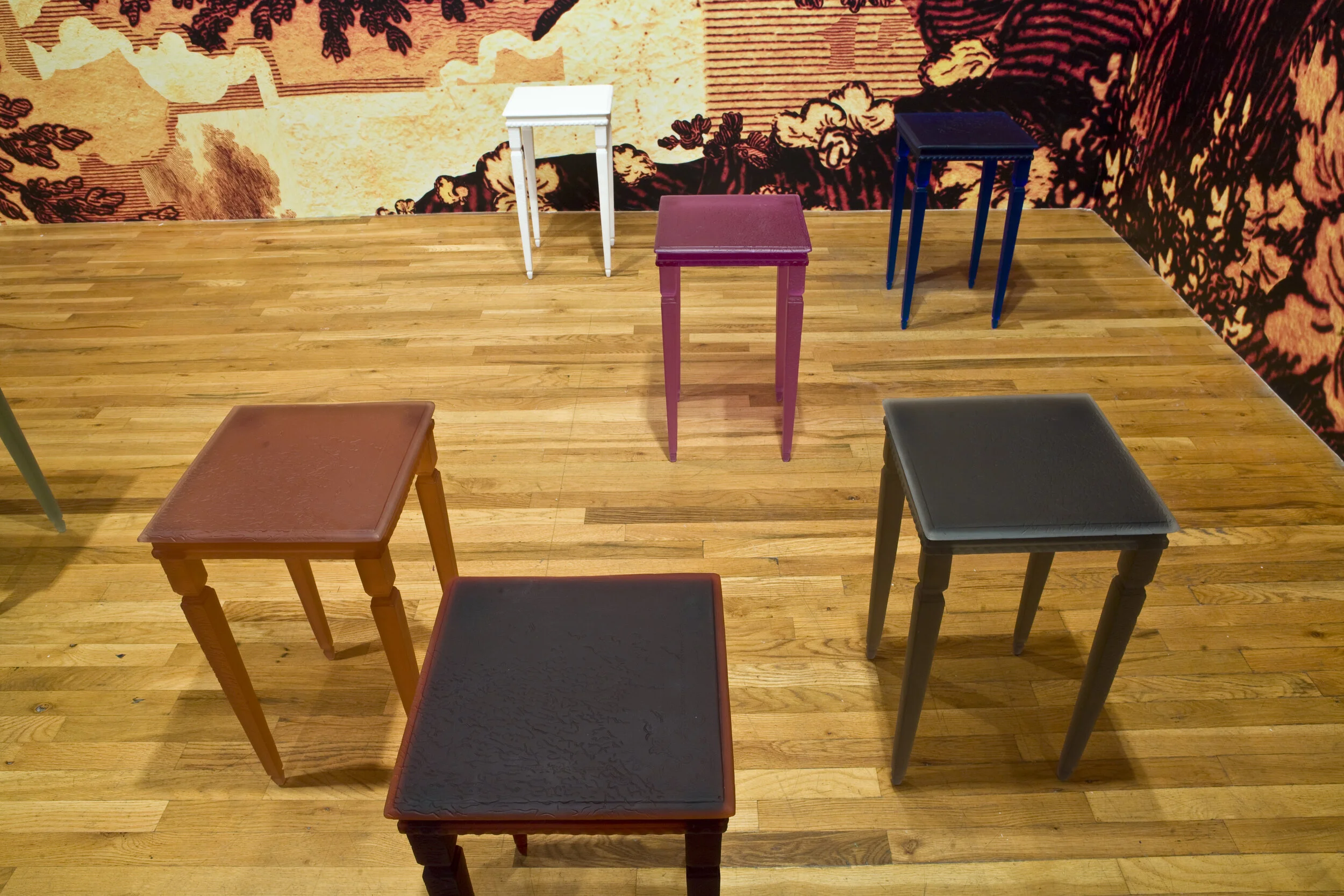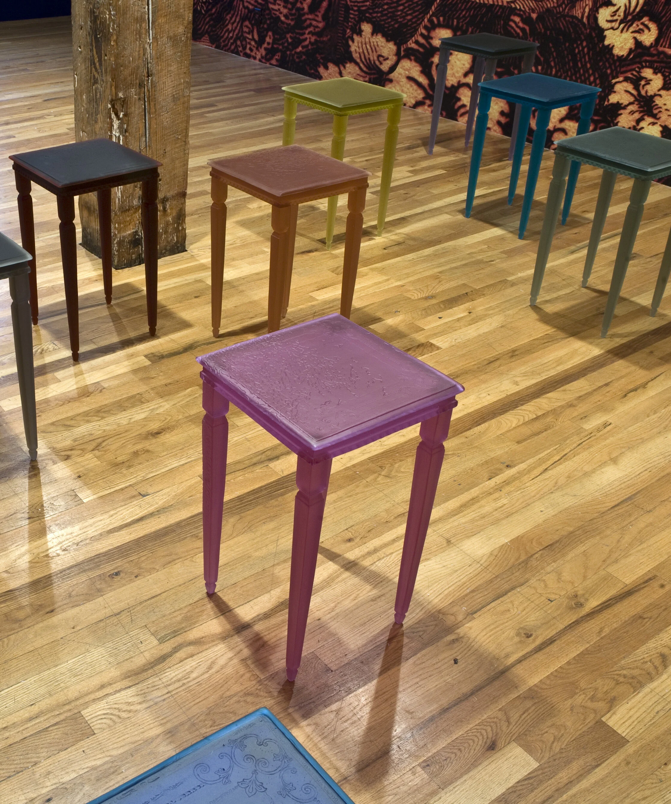 Using alchemy as a jumping-off point, this multimedia, two-part installation explores the act of liberation through transformation, of achieving a spiritual transformation through a brutal physical event. All the works are created via different processes of breaking down and rebuilding: 18th and 19th-century etchings are collaged and digitally manipulated; an antique table is cut in half, resized, and cast in various colors of glass; roadkill turkey feathers are cast in bronze and sterling silver, given new life.