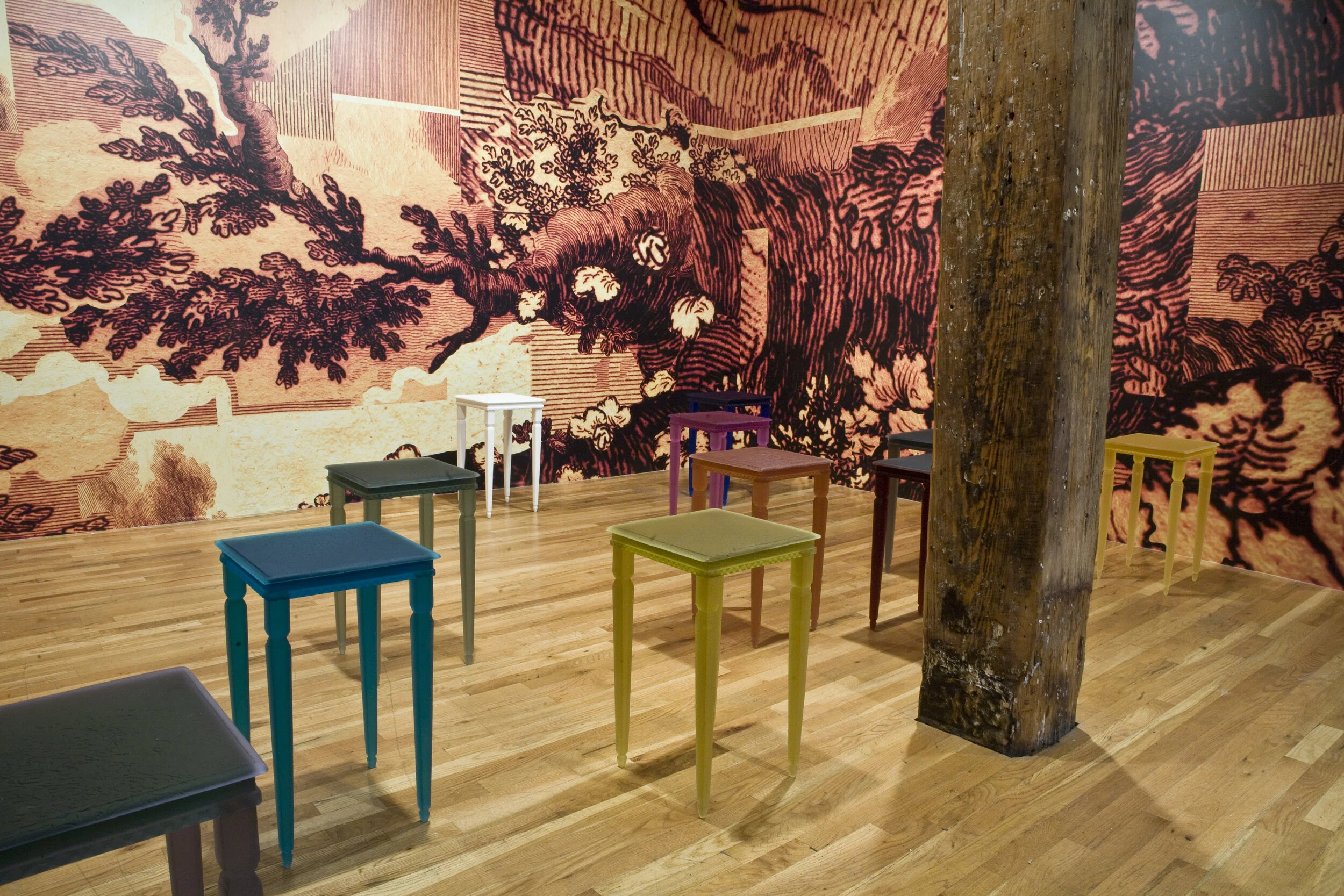 Archival pigment print and pastel on paper (60 x 40 inches each;) bronze feathers (dimensions variable); silver feathers (dimensions variable); archival pigment print on vinyl (dimensions variable); cast and cold-worked glass (12 x 12 x 30 inches each); wood, Fortuny fabric